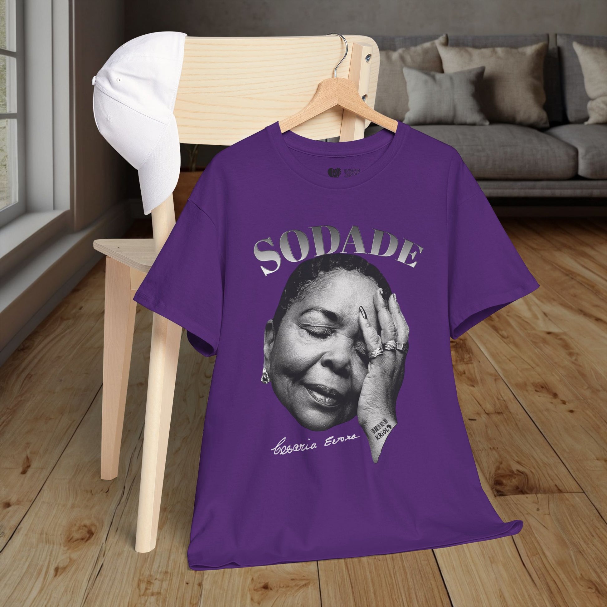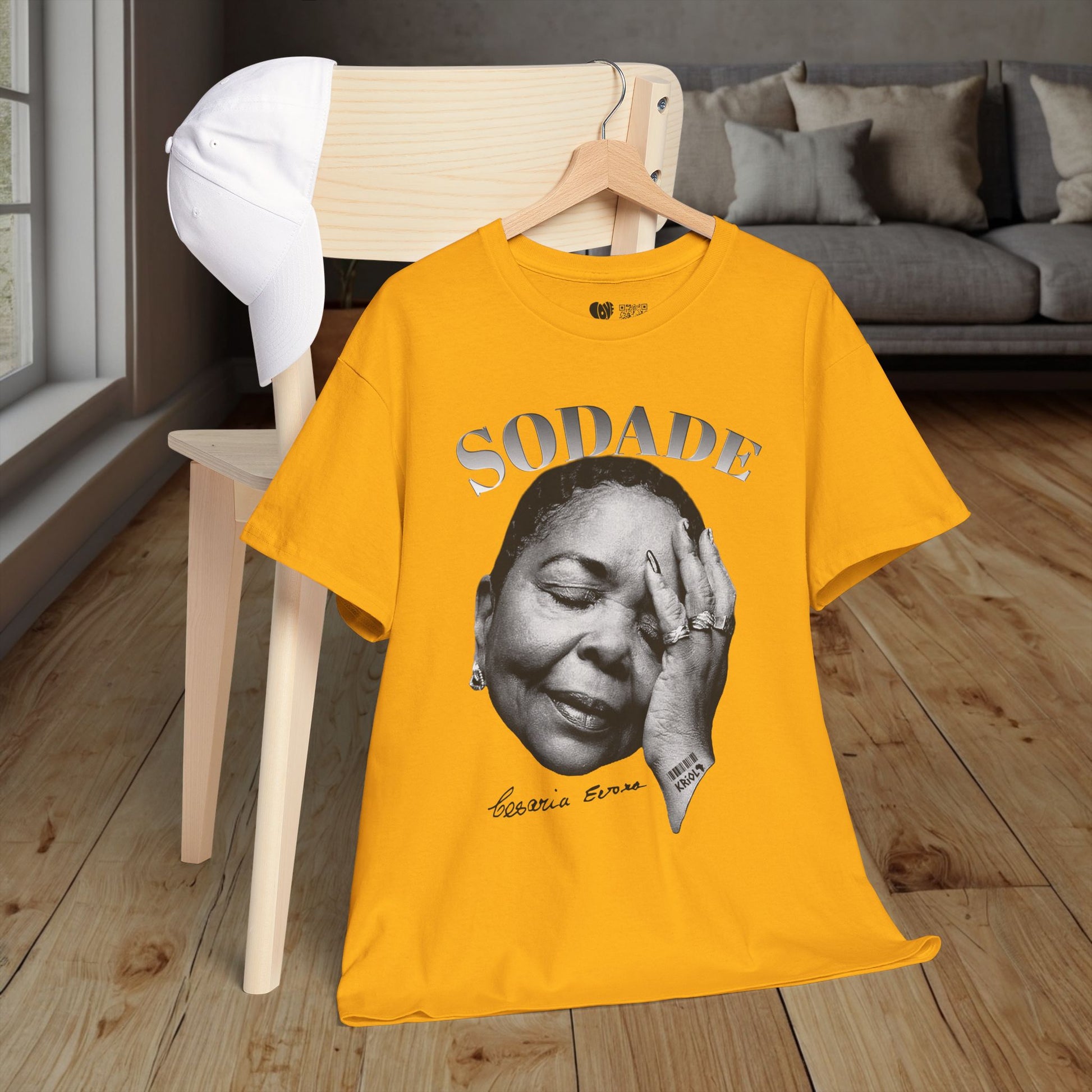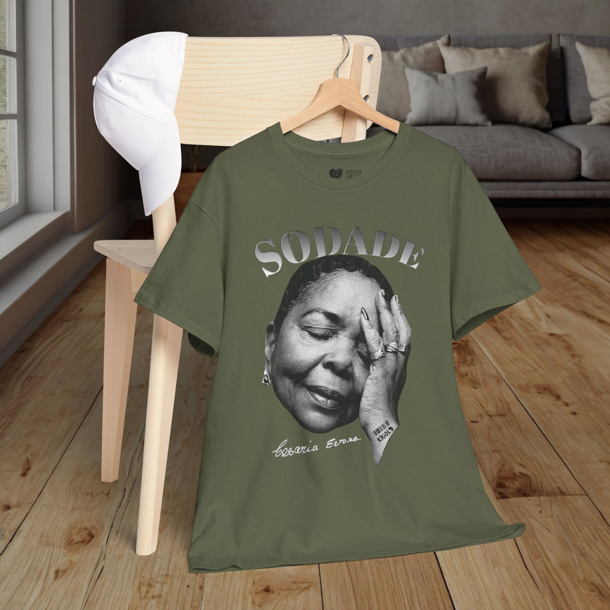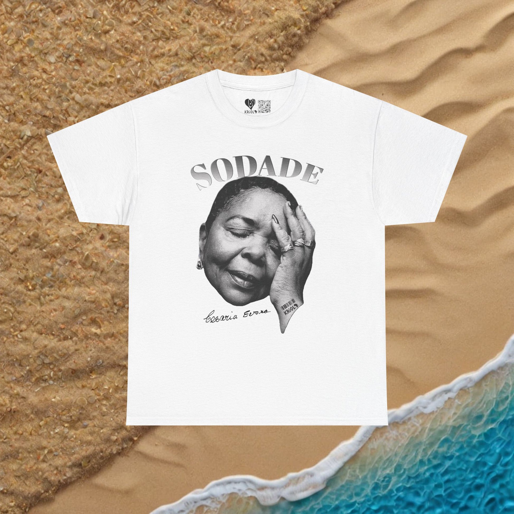 This classic cotton shirt carries a soulful black-and-white portrait of Cesaria Evora and the word “SODADE” above — a quiet nod to longing, saudade, and the heavy sweetness of remembering someone or someplace.