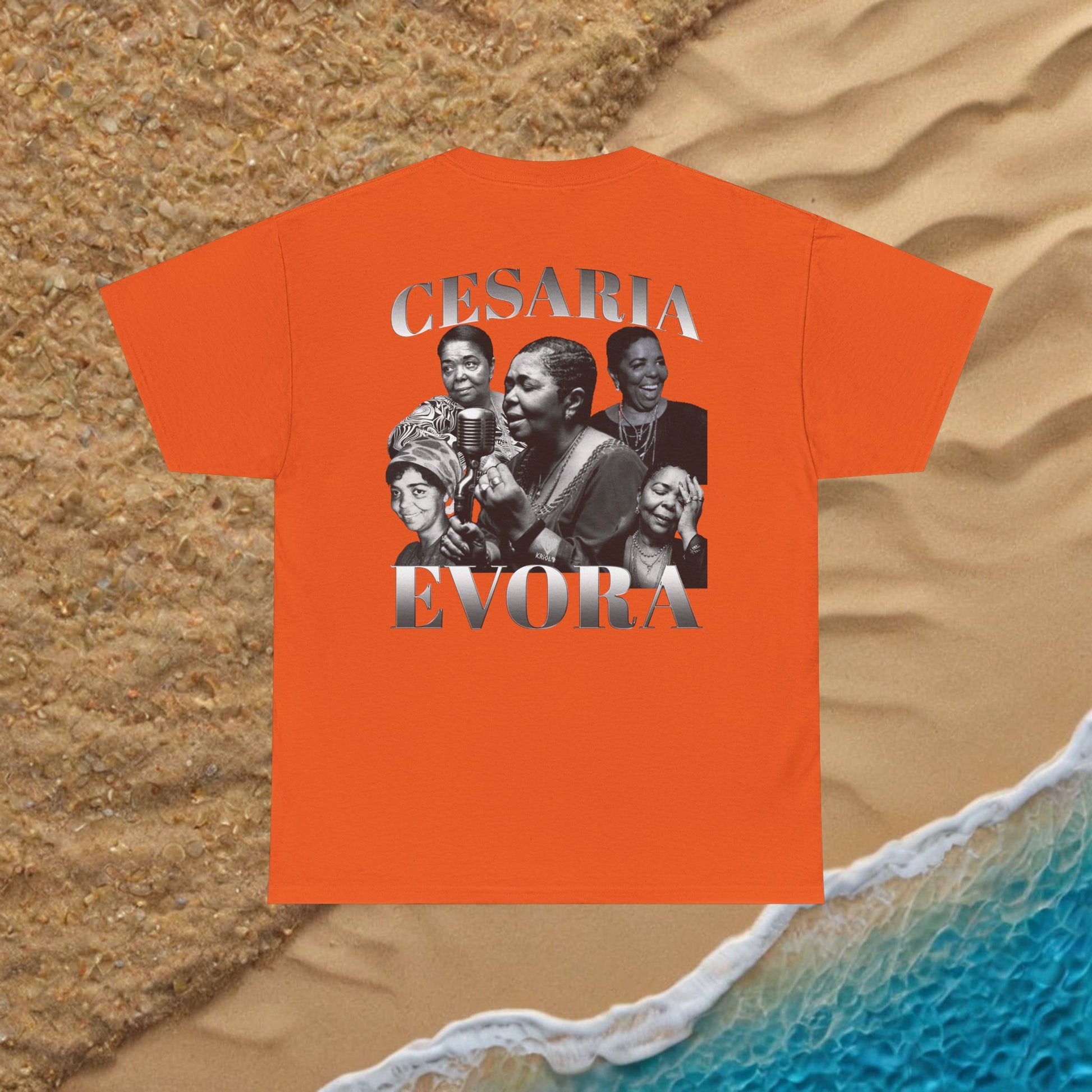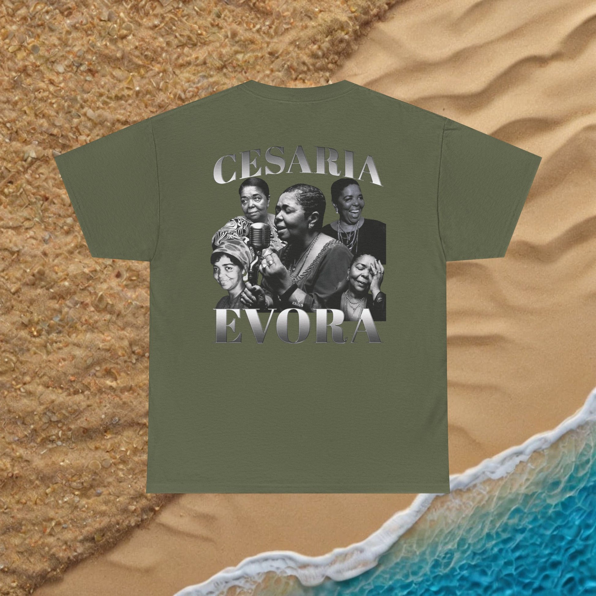 This cotton tee carries a quiet, soulful energy. The front shows a deep and soulful image of Cesaria Evora and her signature beneath, while the back connects multiple photographic moments of her beautiful life into a vintage collage, and her name around it to match.